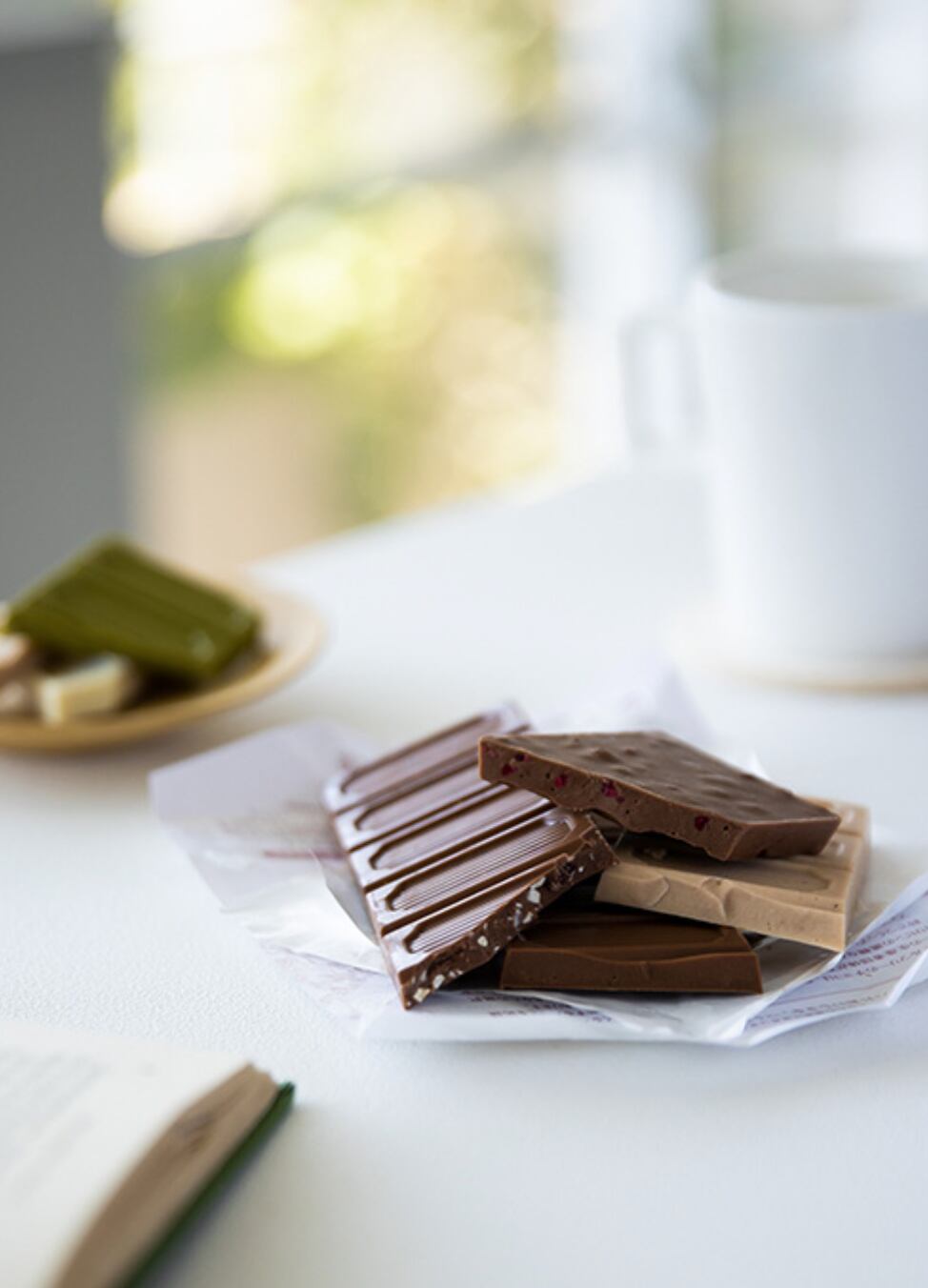 ベースとなるカカオ、黒糖、粗糖をはじめ、トッピング素材もすべて有機原材料を使用し、余計なものは一切加えないシンプルな素材。カカオバターを使用し、スイス伝統の「コンチェ(練り)」技術で長時間丁寧に練ることでまろやかな口どけ。
